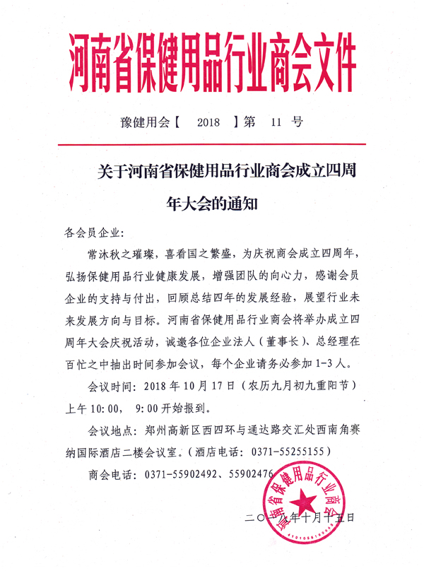 常沐秋之璀璨,喜看国之繁盛,为庆祝商会成立四周年,弘扬保健用品行业健康发展,增强团队的向心力,感谢会员企业的支持与付出,回顾总结四年的发展经验,展望行业未来发展方向与目标。河南省保健用品行业商会将举办成立四周年大会庆祝活动,诚邀各位企业法人(董事长)、总经理在百忙之中抽出时间参加会议,每个企业请务必参加1~3人。