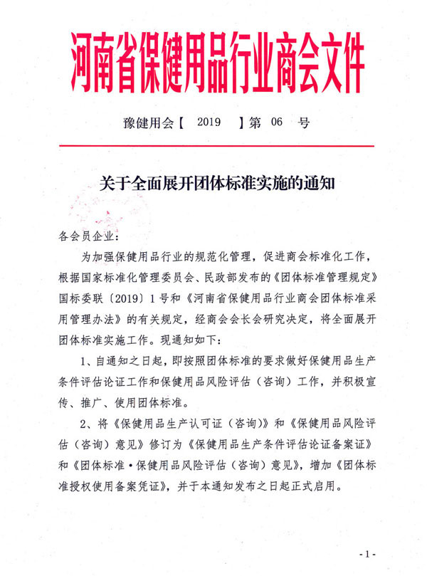 1、自通知之日起,即按照团体标准的要求做好保健用品生产条件评估论证工作和保健用品风险评估(咨询)工作,并积极宣传、推广、使用团体标准。