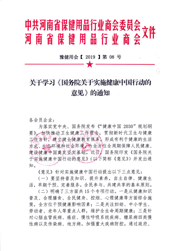 各会员企业要结合实际认真学习,贯彻落实,凝聚自身力量,和商会和众多会员企业一同携手成为一股健康促进的强大合力,为健康中国战略贡献自己的力量。