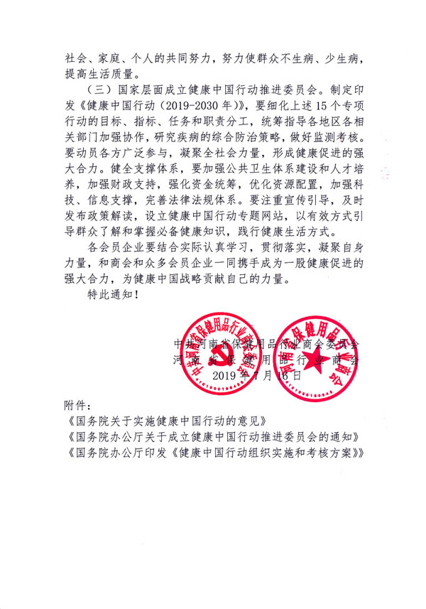 (三)国家层面成立健康中国行动推进委员会。制定印发《健康中国行动(2019-2030年)》,要细化上述15个专项行动的目标、指标、任务和职责分工,统筹指导各地区各相关部门加强协作,研究疾病的综合防治策略,做好监测考核。要动员各方广泛参与,凝聚全社会力量,形成健康促进的强大合力。健全支撑体系,要加强公共卫生体系建设和人才培养,加强财政支持,强化资金统筹,优化资源配置,加强科技、信息支撑,完善法律法规体系。要注重宣传引导,及时发布政策解读,设立健康中国行动专题网站,以有效方式引导群众了解和掌握必备健康知识,践行健康生活方式。