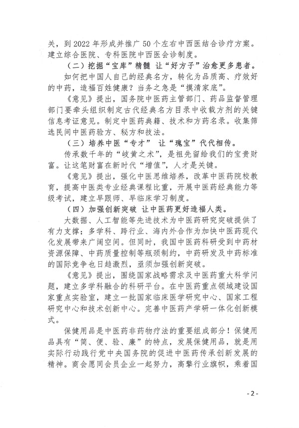 为认真落实习近平总书记关于中医药工作的重要论述,促进中医药传承创新发展,坚持中西医并重、打造中医药和西医药相互补充协调发展的中国特色卫生健康发展模式,发挥中医药原创优势、推动我国生命科学实现创新突破,党中央、国务院26日发布《中共中央 国务院关于促进中医药传承创新发展的意见》(以下简称《意见》)。现将《意见》印发给各会员企业,请认真学习、贯彻执行,做好保健用品的生产研发工作,从实际出发继承好、发展好、利用好我国的中医药,为维护百姓健康贡献一份力量。