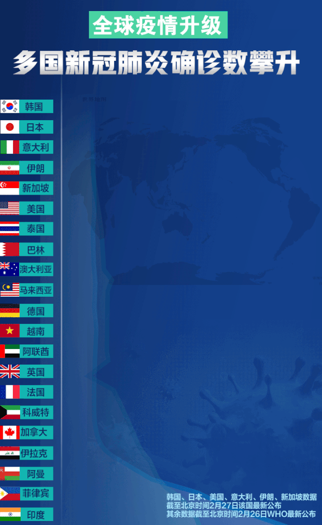 2月24日,巴林、科威特、伊拉克、阿富汗和阿曼相继宣布在本国首次确诊了新冠肺炎病例。
