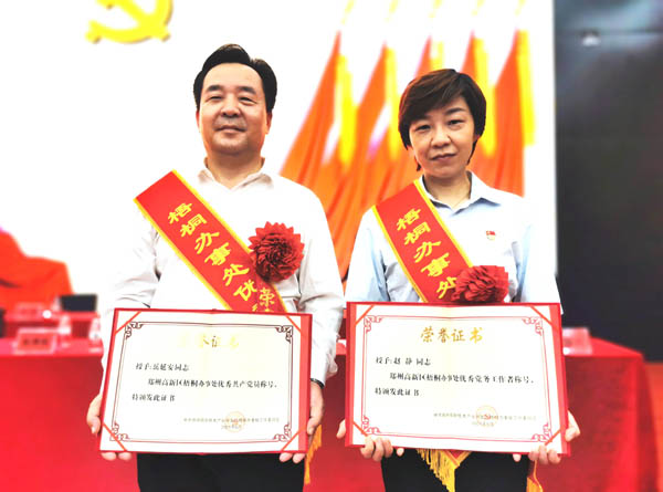 在此普天同庆之际,中共河南省保健用品行业商会委员会在郑州市“两优一先”表彰大会上被授予“先进基层党组织”荣誉称号,党委书记岳延安荣获梧桐办事处“优秀共产党员”称号,二支部组织委员赵静荣获梧桐办事处“优秀党务工作者”称号。这不仅是对我商会及商会党委工作的肯定,更是对我商会全体会员企业守法经营、奉献社会的支持和褒扬!
