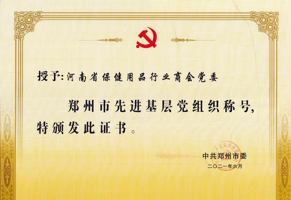 中共河南省保健用品行业商会委员会于2021年6月23日在郑州市“两优一先”表彰大会上被授予“先进基层党组织”称号。