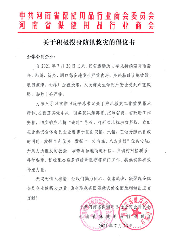 为深入学习贯彻习近平总书记关于防汛救灾工作重要指示精神,全面落实党中央、国务院决策部署,按照省委、省政府工作安排,切实响应汛情“战时”号召,打好防汛抗洪攻坚战。我们在此倡议全体会员企业要勇于直面灾情、汛情,在做好防汛自救的同时,发挥自身优势,发扬“一方有难、八方支援”优良传统,开展力所能及的救援,加强与当地街道社区、乡镇村对接联系,科学安排,积极配合应急救援和医疗等部门工作,提供切实有效补充力量。