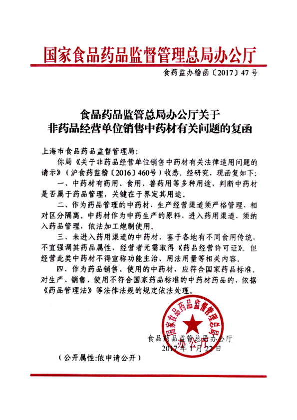 附件一:国家食品药品监督管理总局办公厅食药监办稽函〔2017〕47号文件