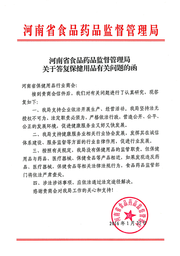 附件三:河南省食药监局关于答复保健用品有关问题的函