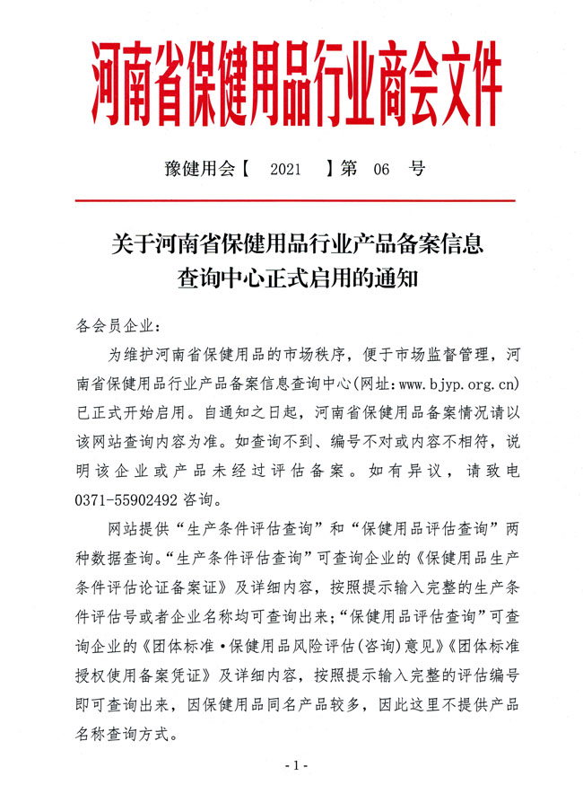 为维护河南省保健用品的市场秩序,便于市场监督管理,河南省保健用品行业产品备案信息查询中心(网址:www.bjyp.org.cn)已正式开始启用。自通知之日起,河南省保健用品备案情况请以该网站查询内容为准。如查询不到、编号不对或内容不相符,说明该企业或产品未经过评估备案。如有异议,请致电0371-55902492咨询。