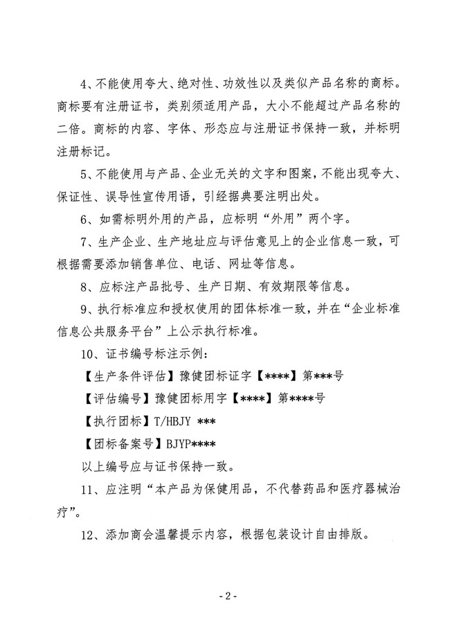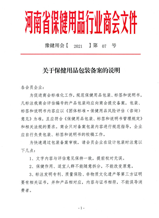为促进商会标准化工作,规范保健用品包装、标签和说明书,凡标注我商会评估编号的产品包装均应向商会提交备案,包装、标签和说明书内容应以《团体标准·保健用品风险评估(咨询)意见》为准,且应符合《保健用品包装、标签和说明书管理规定》和相关法规的要求。商会只对备案包装内容进行规范指导,企业应自行负责包装、标签和说明书的校稿工作。