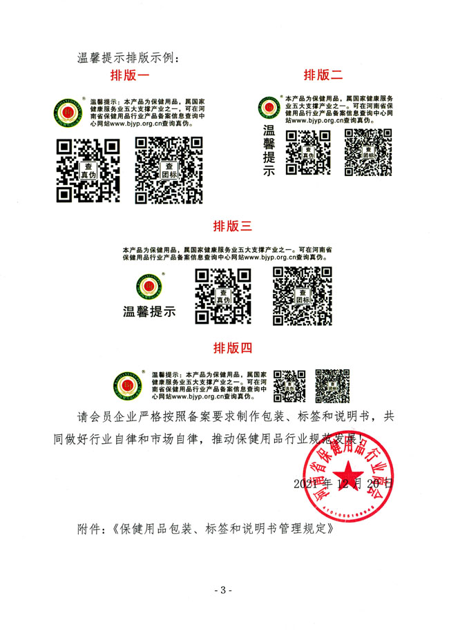 请会员企业严格按照备案要求制作包装、标签和说明书,共同做好行业自律和市场自律,推动保健用品行业规范发展!