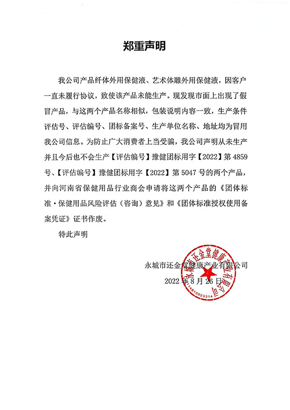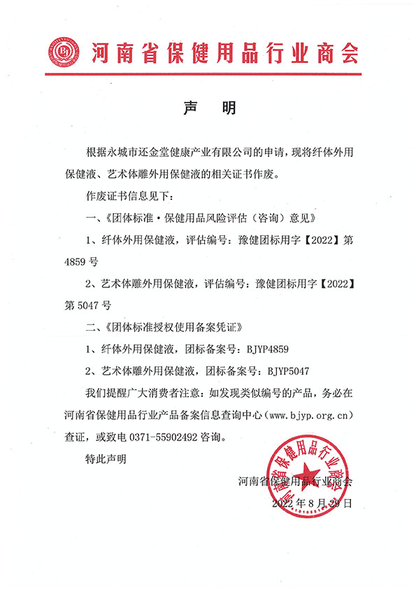 根据永城市还金堂健康产业有限公司的申请,现将纤体外用保健液、艺术体雕外用保健液的相关证书作废。