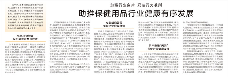 河南省保健用品行业商会自成立以来,始终不忘初心,充分发挥行业协会在行业咨询、标准制定、行业自律和第三方评价等方面的积极作用,相继制定了《河南省保健用品行业管理规定》《保健用品包装、标签和说明书管理规定》《会员诚信考核管理办法》和《团体标准》等自律性制度,同时设立了市场自律监督管理委员会、法律事务委员会、团体标准委员会、风险评估(咨询)委员会、艾产业发展工作委员会多个部门,通过商会党委纪委的党内监督、市场自律监督、制定和完善“约谈制度”、企业生产条件评估、保健用品风险评估(咨询)、开设法律咨询和投诉热线、产品备案和网站公示等一系列自律监督措施,规范和引导企业的生产经营活动。