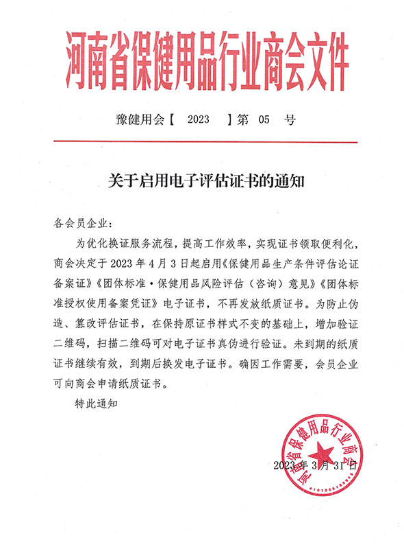 为优化换证服务流程,提高工作效率,实现证书领取便利化,商会决定于2023年4月3日起启用《保健用品生产条件评估论证备案证》《团体标准·保健用品风险评估(咨询)意见》《团体标准授权使用备案凭证》电子证书,不再发放纸质证书。为防止伪造、篡改评估证书,在保持原证书样式不变的基础上,增加验证二维码,扫描二维码可对电子证书真伪进行验证。未到期的纸质证书继续有效,到期后换发电子证书。确因工作需要,会员企业可向商会申请纸质证书。