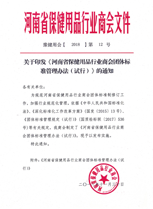 为规范河南省保健用品行业商会团体标准制修订工作,加强行业规范化管理,依据《中华人民共和国标准化法》、《深化标准化工作改革方案》(国发〔2015〕13号)、《团体标准管理规定(试行)》(国质检标联〔2017〕536号)等有关规定,我商会制定了《河南省保健用品行业商会团体标准管理办法(试行)》,现予以发布实施。
