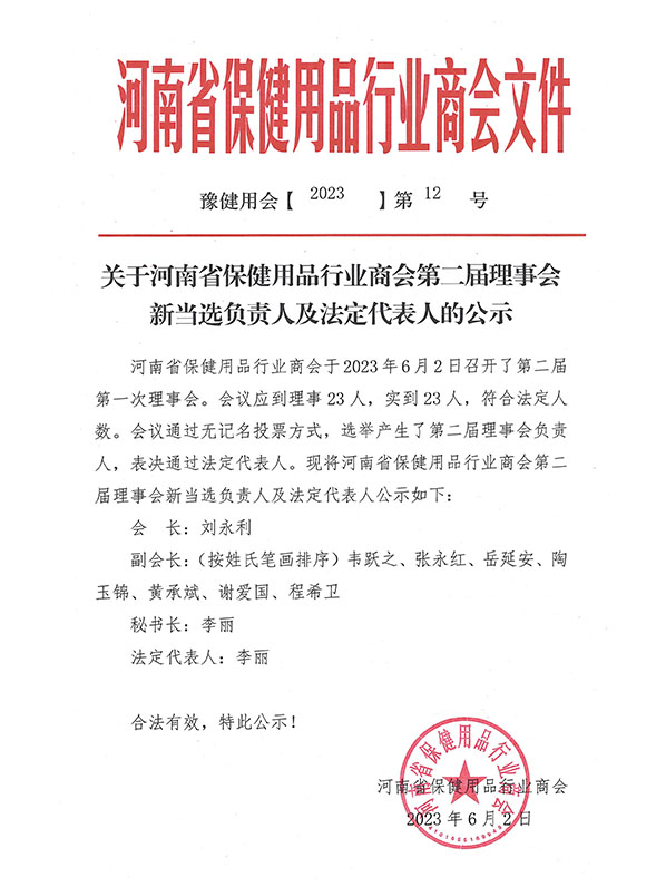 河南省保健用品行业商会于2023年6月2日召开了第二届第一次理事会。会议应到理事23人,实到23人,符合法定人数。会议通过无记名投票方式,选举产生了第二届理事会负责人,表决通过法定代表人。现将河南省保健用品行业商会第二届理事会新当选负责人及法定代表人公示如下: