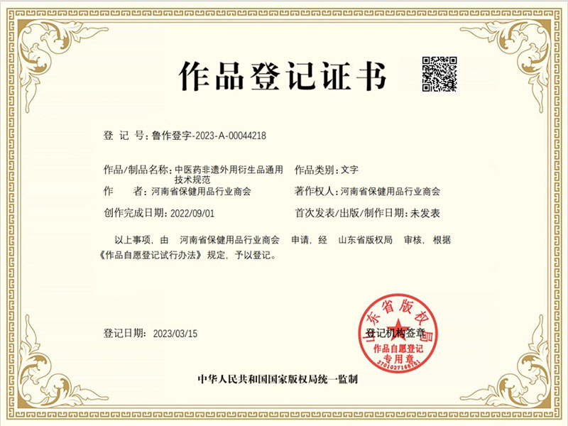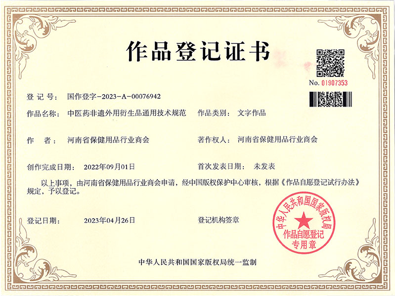 为促进中医药非物质文化遗产传承创新发展,切实解决传承企业的发展需求,规范外用衍生品的生产经营,开展外用衍生品产品质量标准化工作,根据《中华人民共和国标准化法》和《团体标准管理规定》(国标委联〔2019〕1号)的有关规定,河南省保健用品行业商会组织制定了T/HBJY 004—2022《中医药非遗外用衍生品通用技术规范》团体标准,于2022年9月1日正式发布。本团体标准已向国家版权局和山东省版权局申请了知识产权保护,并先后收到了《作品登记证书》。任何组织和个人未经书面授权,不得擅自印刷或以其他任何形式复制、编辑、传播、汇编、修改、模仿、抄袭、重新发布本团体标准内容,否则将依法追究法律责任。
