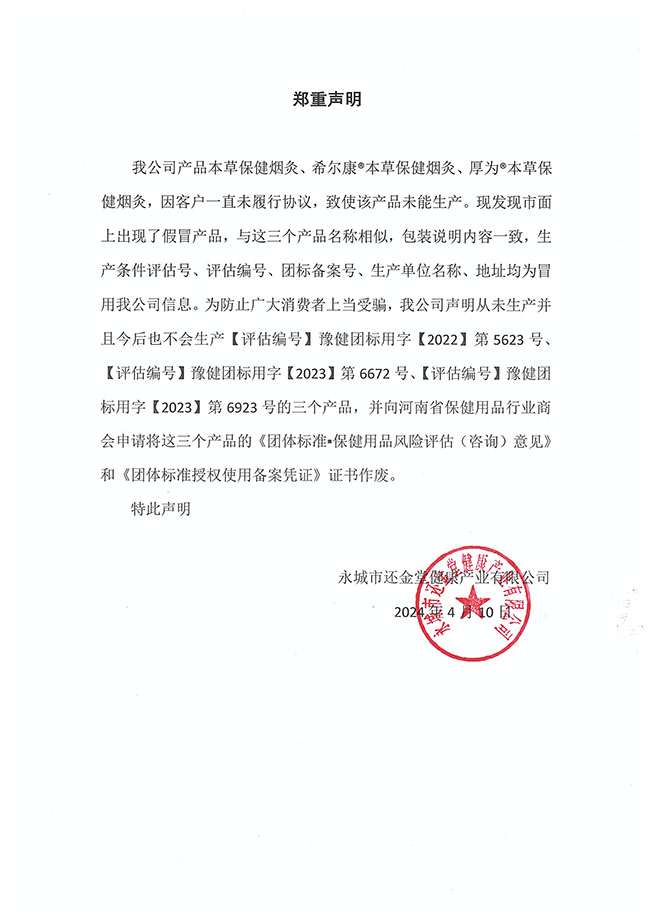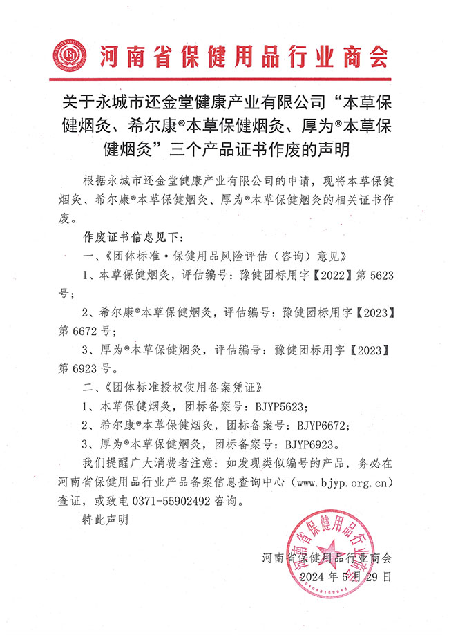 根据永城市还金堂健康产业有限公司的申请,现将本草保健烟灸、希尔康®本草保健烟灸、厚为®本草保健烟灸的相关证书作废。