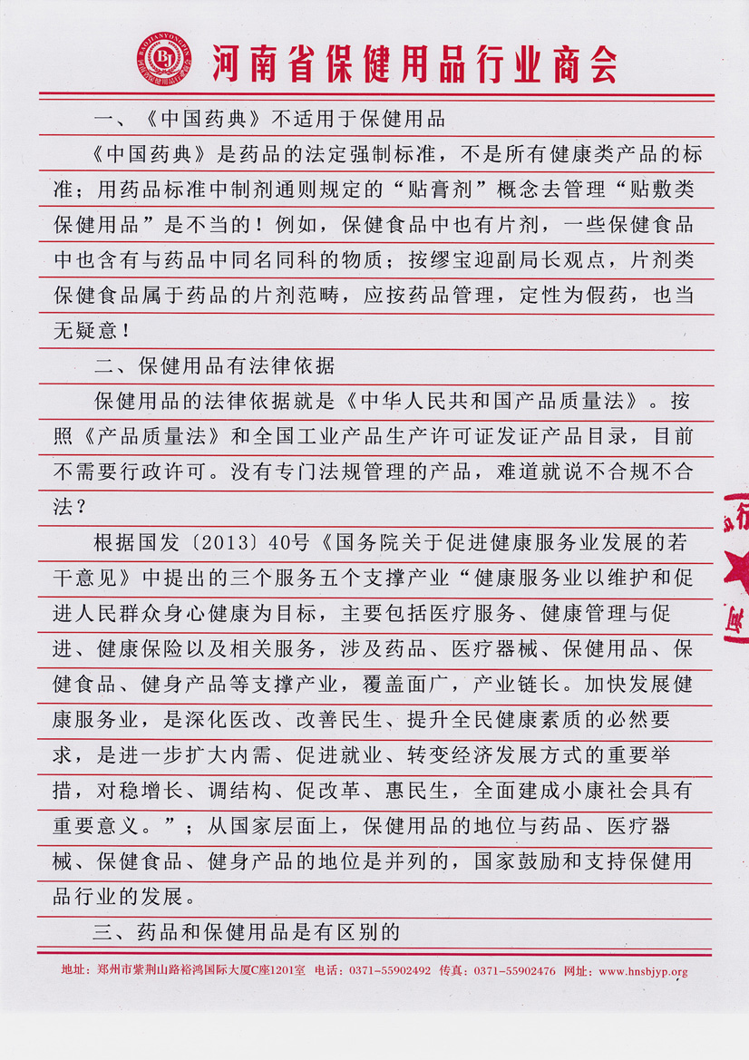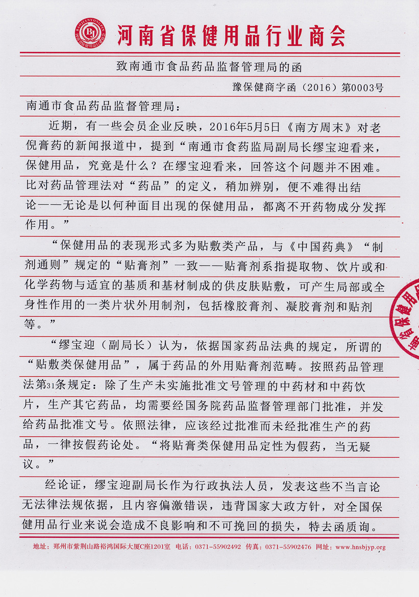 近期,有一些会员企业反映,2016年5月5日《南方周末》对老倪膏药的新闻报道中,提到“南通市食药监局副局长缪宝迎看来,保健用品,究竟是什么?在缪宝迎看来,回答这个问题并不困难。比对药品管理法对“药品”的定义,稍加辨别,便不难得出结论——无论是以何种面目出现的保健用品,都离不开药物成分发挥作用。”