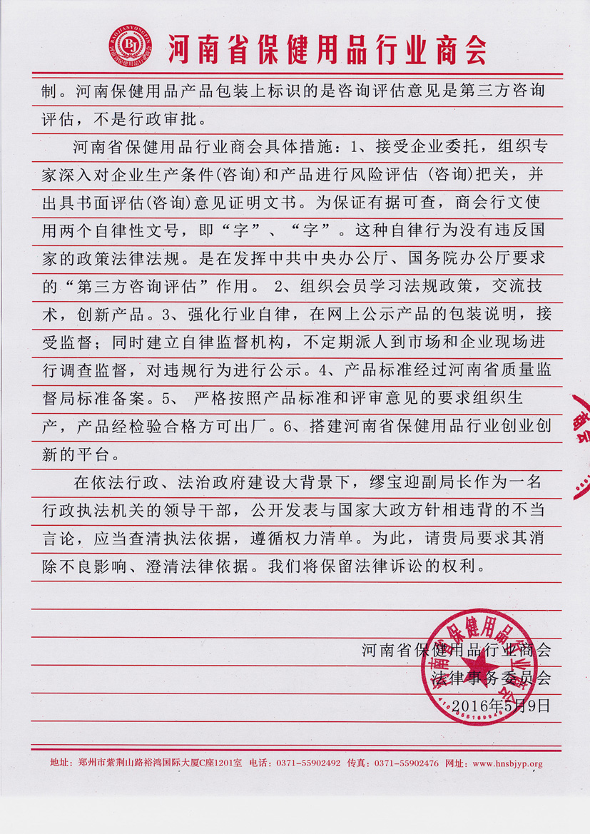 河南省保健用品行业商会具体措施:1.接受企业委托,组织专家深入对企业生产条件(咨询)和产品进行风险评估 (咨询)把关,并出具书面评估(咨询)意见证明文书。为保证有据可查,商会行文使用两个自律性文号,即“字”、“字”。这种自律行为没有违反国家的政策法律法规。是在发挥中共中央办公厅、国务院办公厅要求的“第三方咨询评估”作用。 2.组织会员学习法规政策,交流技术,创新产品。3.强化行业自律,在网上公示产品的包装说明,接受监督;同时建立自律监督机构,不定期派人到市场和企业现场进行调查监督,对违规行为进行公示。4.产品标准经过河南省质量监督局标准备案。5.严格按照产品标准和评审意见的要求组织生产,产品经检验合格方可出厂。6.搭建河南省保健用品行业创业创新的平台。