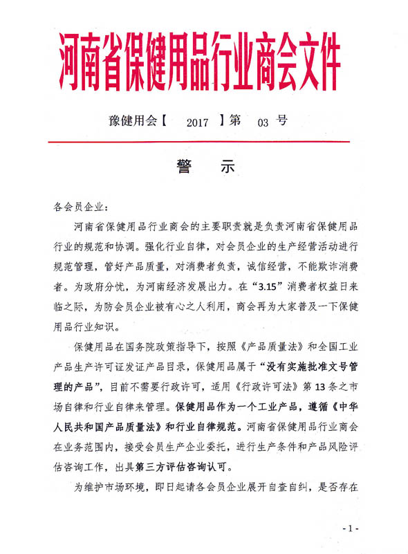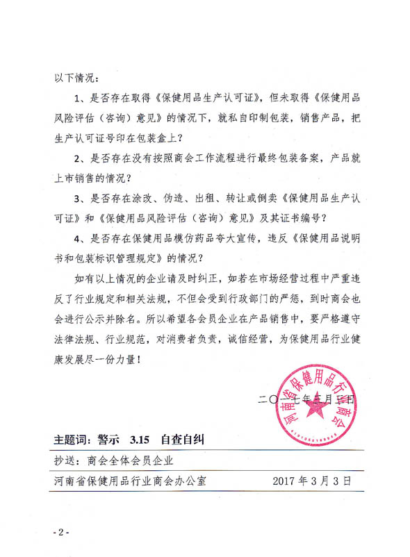 如有以上情况的企业请及时纠正,如若在市场经营过程中严重违反了行业规定和相关法规,不但会受到行政部门的严惩,到时商会也会进行公示并除名。所以希望各会员企业在产品销售中,要严格遵守法律法规、行业规范,对消费者负责,诚信经营,为保健用品行业健康发展尽一份力量!