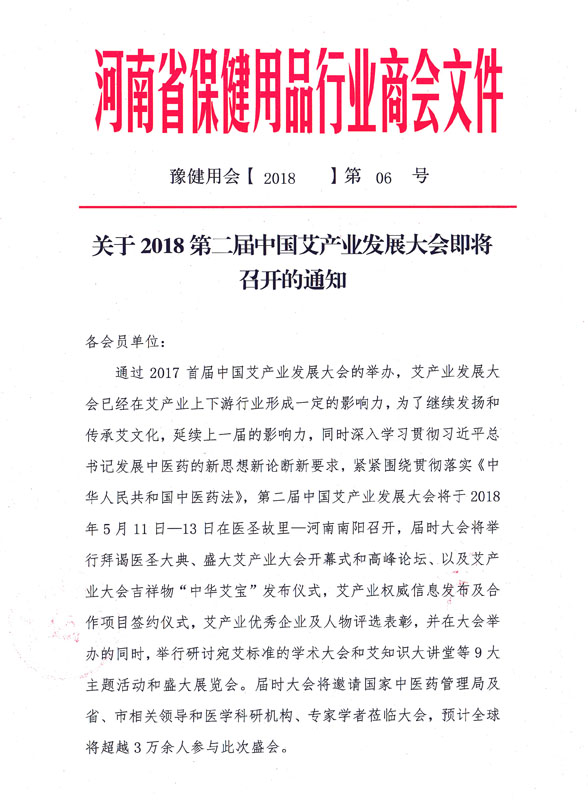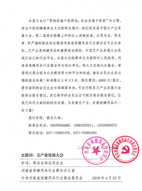 本届大会以“贯彻实施中医药法,依法发展中医药”为主题,突出中医药健康养生文化的特色展示。相比较首届中国艾产业发展大会,第二届将在规模上和形式上突破前者,以更专业、更完美、更严谨的服务信念邀请河南省保健用品行业商会会员企业参加。艾产业是保健用品的重要组成部份,中国艾产业发展大会是我们自己的行业节会。本届大会统筹单位为南阳市人民政府,河南省保健用品行业商会作为协办单位,将大力支持此次盛会,希望通过展会能为企业提供更大的平台和收益,请各会员企业务必踊跃报名参展!标准展位3米×3米,展位费用:6000元/展位。要求南阳的会员企业全部都要参加,可自行联系艾产业发展大会组委会报名登记,其它地市的会员企业可联系商会报名登记,让我们共同为南阳的经济发展,为发展艾产业、发展保健用品尽一份力量!