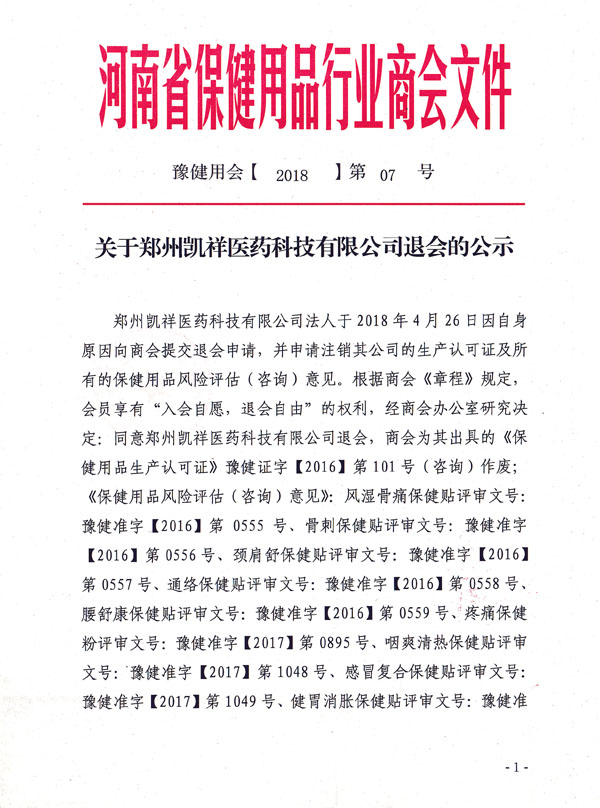 郑州凯祥医药科技有限公司法人于2018年4月26日因自身原因向商会提交退会申请,并申请注销其公司的生产认可证及所有的保健用品风险评估(咨询)意见。根据商会《章程》规定,会员享有“入会自愿,退会自由”的权利,经商会办公室研究决定:同意郑州凯祥医药科技有限公司退会,商会为其出具的《保健用品生产认可证》豫健证字【2016】第101号(咨询)作废;《保健用品风险评估(咨询)意见》:风湿骨痛保健贴评审文号:豫健准字【2016】第0555号、骨刺保健贴评审文号:豫健准字【2016】第0556号、颈肩舒保健贴评审文号:豫健准字【2016】第0557号、通络保健贴评审文号:豫健准字【2016】第0558号、腰舒康保健贴评审文号:豫健准字【2016】第0559号、疼痛保健粉评审文号:豫健准字【2017】第0895号、咽爽清热保健贴评审文号:豫健准字【2017】第1048号、感冒复合保健贴评审文号:豫健准字【2017】第1049号、健胃消胀保健贴评审文号:豫健准字【2017】第1050号、强肺100保健贴评审文号:豫健准字【2017】第1051号、肠舒保健贴评审文号:豫健准字【2017】第1052号、腹泻保健贴评审文号:豫健准字【2017】第1053号、力康保健贴评审文号:豫健准字【2017】第1054号、退热保健贴评审文号:豫健准字【2017】第1055号等(咨询)作废。