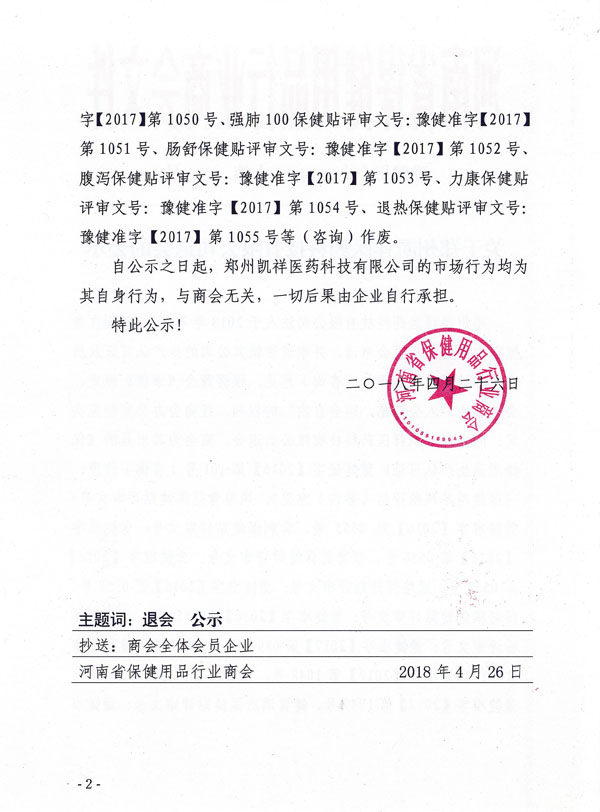 自公示之日起,郑州凯祥医药科技有限公司的市场行为均为其自身行为,与商会无关,一切后果由企业自行承担。